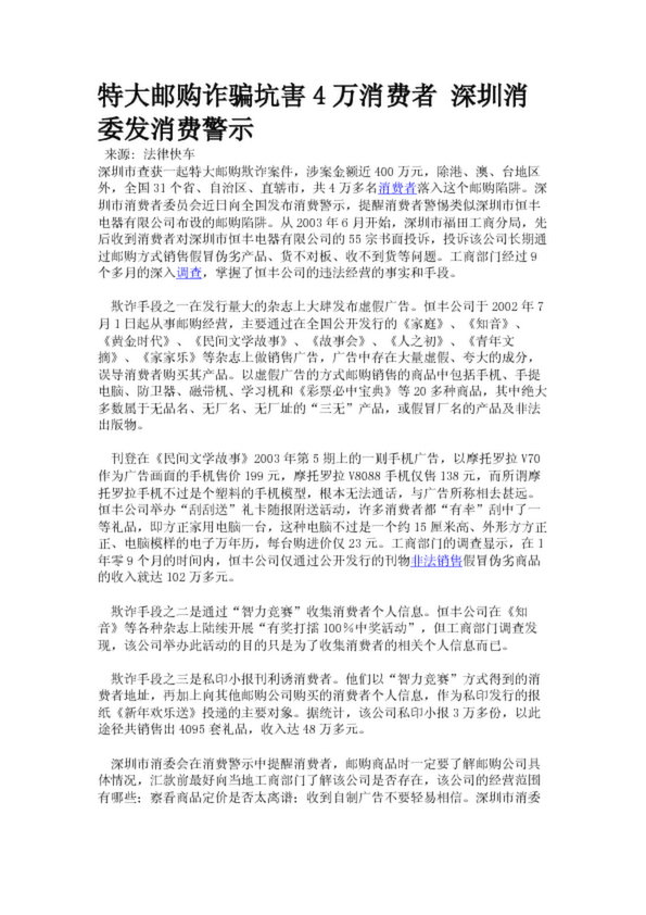 特大郵購(gòu)詐騙坑害4萬(wàn)消費(fèi)者 深圳消委發(fā)消費(fèi)警示