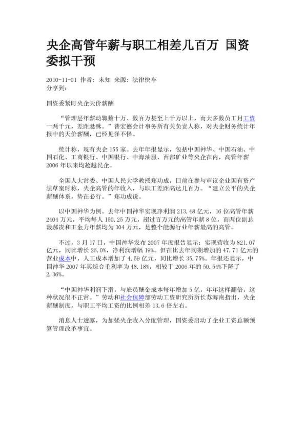 央企高管年薪與職工相差幾百萬 國資委擬干預