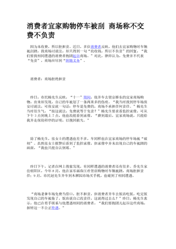 消費(fèi)者宜家購物停車被刮 商場稱不交費(fèi)不負(fù)責(zé)