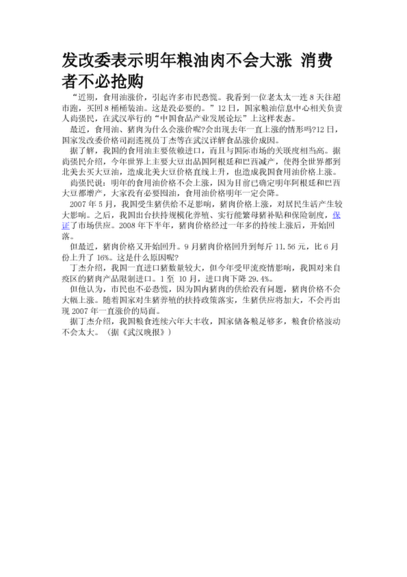 發改委表示明年糧油肉不會大漲 消費者不必搶購
