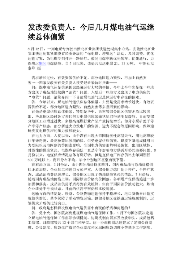 發改委負責人:今后幾月煤電油氣運繼續總體偏緊