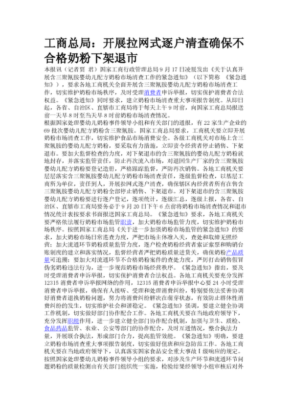工商總局:開展拉網式逐戶清查確保不合格奶粉下架退市