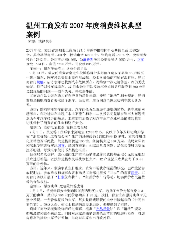 溫州工商發布2007年度消費維權典型案例(49.59KB)