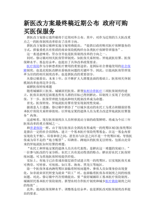 新醫改方案最終稿近期公布 政府可購買醫保服務