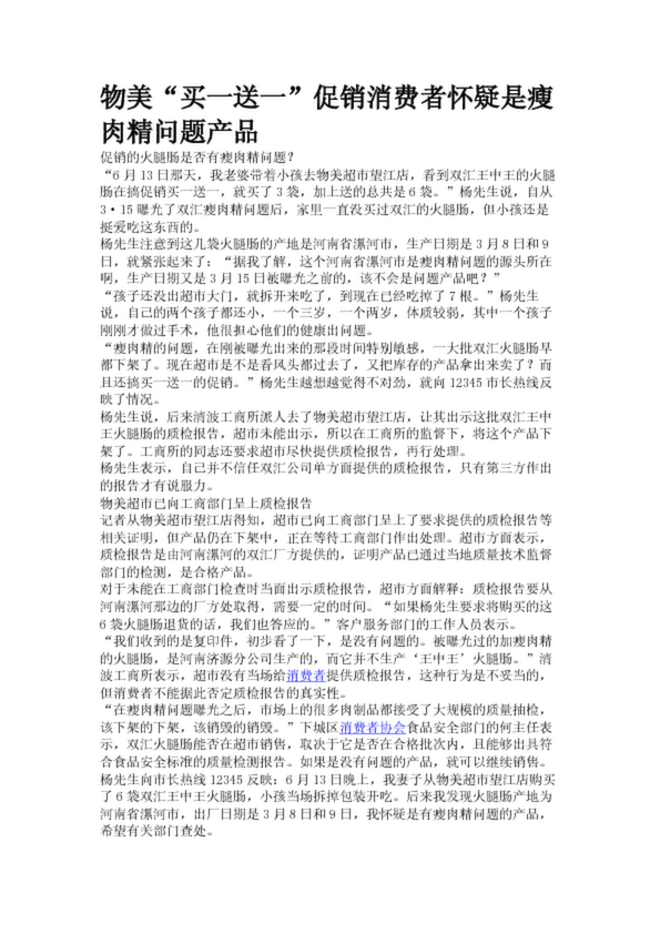 物美“買一送一”促銷消費者懷疑是瘦肉精問題產品(21.17KB)
