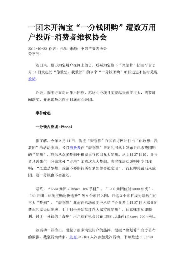 一團未開淘寶“一分錢團購”遭數萬用戶投訴-消費者維權協會
