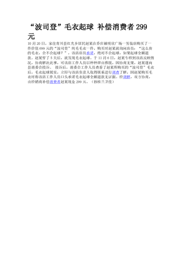 “波司登”毛衣起球 補償消費者299元