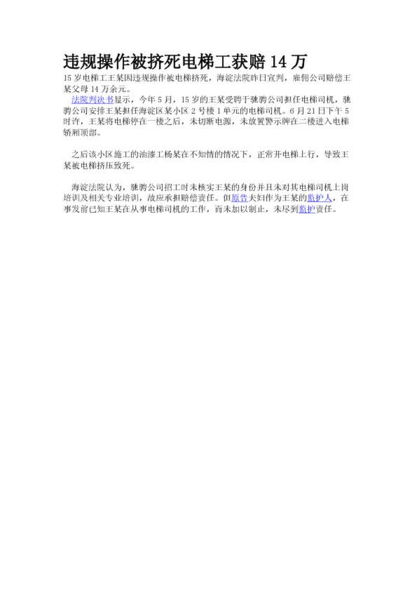 違規操作被擠死電梯工獲賠14萬(17.89KB)