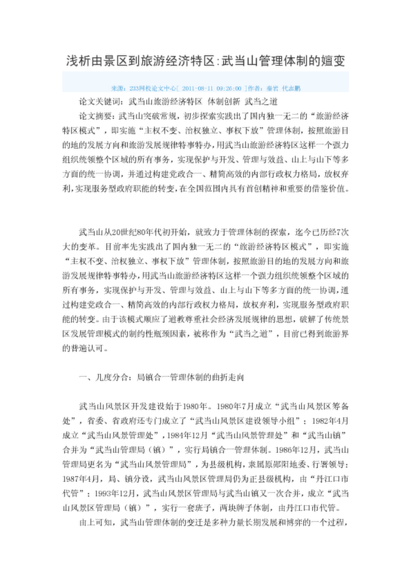 淺析由景區到旅游經濟特區武當山管理體制的嬗變