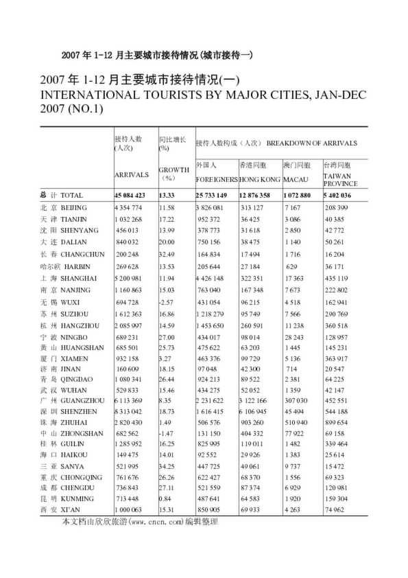 2007年1-12月主要城市接待情況(城市接待一)(0.16MB)