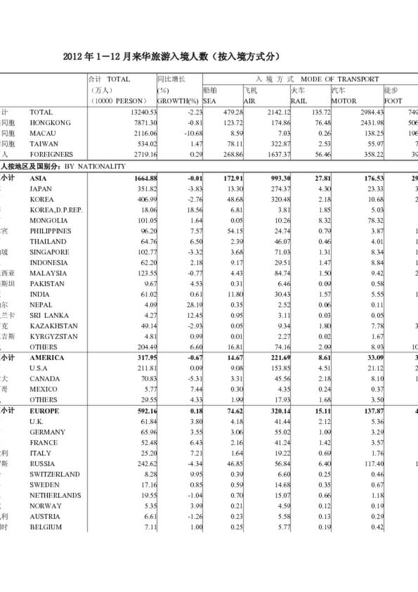 1-12月來華旅游入境人數(按入境方式分)