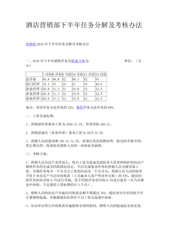 營銷業績完成與否,營銷總監和部門經理參照酒店 2011 年經營績效考核責任書規定執行...經理的考核 任務; 2、營銷部內部實行任務分解不影響總任務數的完成和業績提成獎...