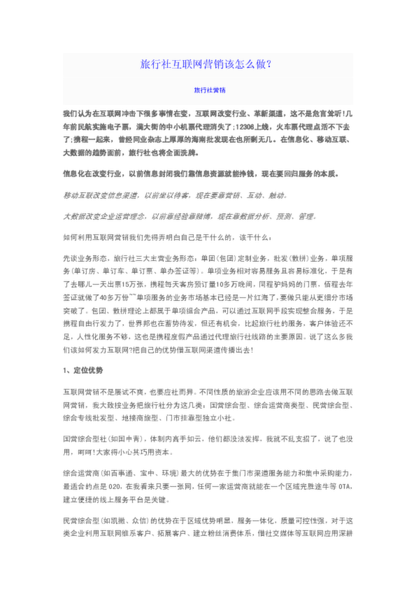 網(wǎng)絡營銷,說白了,就是在互聯(lián)網(wǎng)上賣東西,對于旅行社來說,開展網(wǎng)絡營銷主要是在...做好網(wǎng)絡廣告的要點,在于選擇到哪個網(wǎng)站去做網(wǎng)絡廣告。 視頻營銷:視頻營銷即用...
