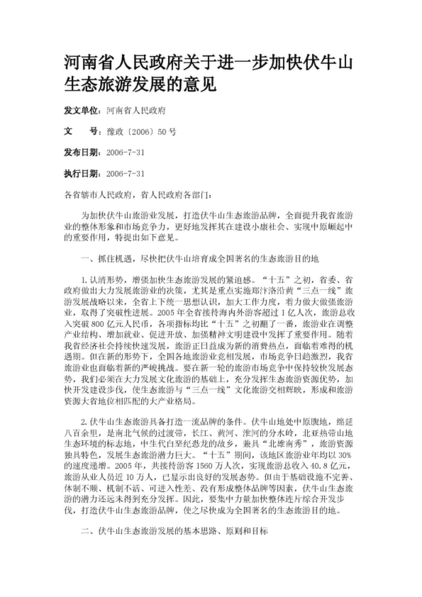 河南省人民政府關于進一步加快伏牛山生態旅游發展的意見
