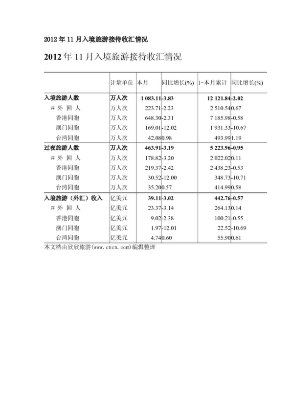 2012年11月入境旅游接待收匯情況