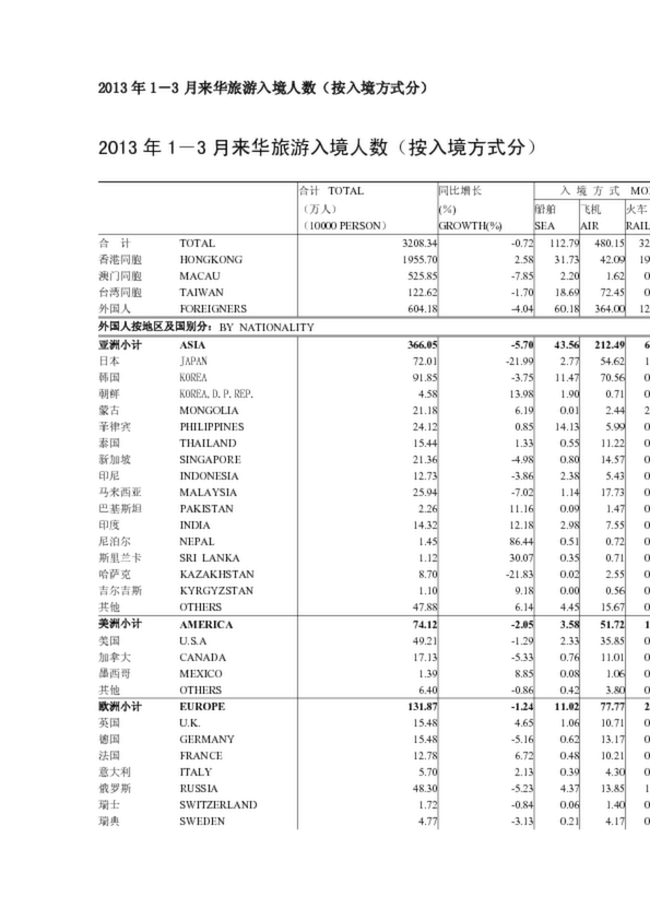 2013年1-3月來華旅游入境人數(按入境方式分)