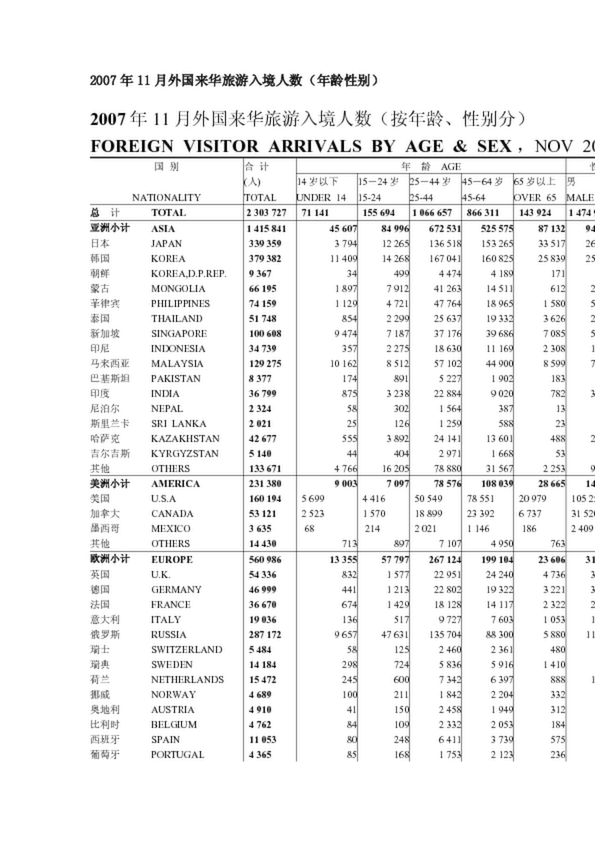 2007年11月外國來華旅游入境人數(年齡性別)(0.27MB)