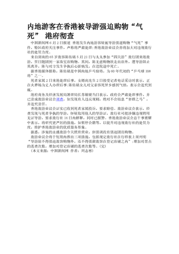 內地游客在香港被導游強迫購物“氣死” 港府徹查(18.67KB)