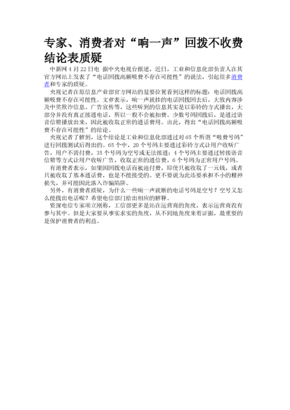 專家、消費者對“響一聲”回撥不收費結論表質疑